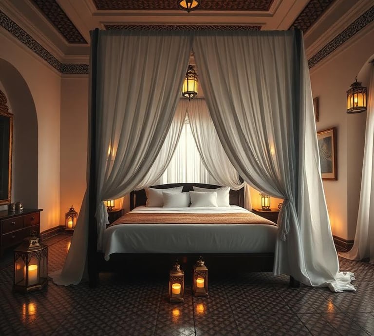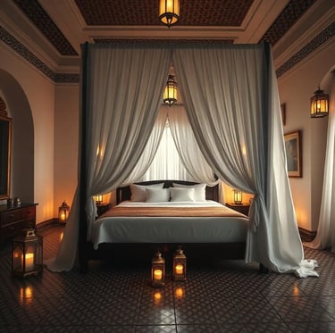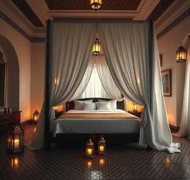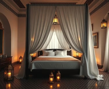Plongez dans le luxe d'une chambre spacieuse ornée de lanternes en cuivre et de tissus berbères raffinés.